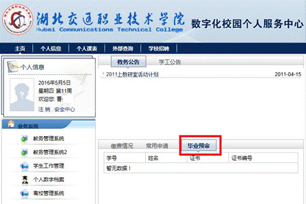 ⑵学生本人通过对个人毕业信息以及6项离校项目进行核查,若全部通过,返回《个人服务中心》可查看《毕业预审》告知(毕业、结业、肄业)。